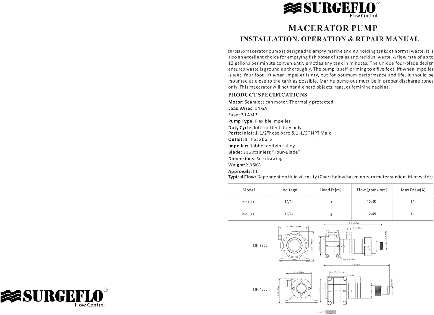 Description:This self-priming RV macerator pump is here to help you with its thoughtful design and powerful performance.It connects to your black water tank termination valve and grinds the contents inside to turn them into small particles, allowing you to empty them faster and easier.When overheating and overload occur, it will automatically stop to prevent damage to the pump.This pump has a powerful 2900 RPM pure copper motor, low power consumption, high performance, and an excellent flow rate of 8.45 gallons per minute, which can quickly clean and drain sewage.The RV macerator pump is made of high-quality PA66 and 30% glass fiber material, so it has pressure resistance, high strength, and less leakage. Meanwhile, the rubber impeller is resistant to high temperatures.With the pure copper motor and rubber anti-vibration feet, the RV macerator pump's operation noise is only 55-60 dB and will not affect your daily life.The 304 stainless steel double blades provide it with a strong grinding capacity so that it can grind solids into fine particles, which are easy to empty.The super vacuum self-priming function allows it to reach a self-priming range of 3.3ft, which facilitates excellent work and makes it cleaning-free.The 1.5" inlet pipe interface and 1.1" outlet interface make it easily installed in most RVs without leakage.The center cap is made of rubber wood with excellent heat resistance, insulation, and shock resistance.The macerator pump can be used for livestock farms, mobile sewage equipment, kitchen waste, etc. and can be used in RVs.Specifications:Model: MP-4500Material: PA66, 30% Glass Fiber, Rubber, 304 Stainless SteelColor: BlackVoltage: 12VFrequency: 50 HzCurrent: 9.5ARotational Speed: 2900RPMInsulation Grade: Grade EOperating Noise: 55-60 dbMedium Temperature: 0-65℃/30-150℉Ambient Temperature: ≤50℃/120℉Medium PH: 5.0-7.5Wiring Method: Double-core WireFlow Rate: 8.45 GPMSuction Range: 3.3ftMax Lift: 10ftPower: 114WInlet Pipe Inner Diameter: 1.5''Inner Diameter Of Outlet Pipe: 1.1''Control Method: Power SwitchGross Weight: 5 lbsNet Weight: 4.5 lbsPump Size: 11'' x 4'' x 4''Package Size: 12'' x 5'' x 5''Package Includes:1 x RV Macerator Pump1 x User ManualInstallations:1. Install the hose at the water inlet and outlet.2. Rotate the upper clamp to seal tightly.3. Then connect the 12V20A or more power adapter, and the installation is complete.