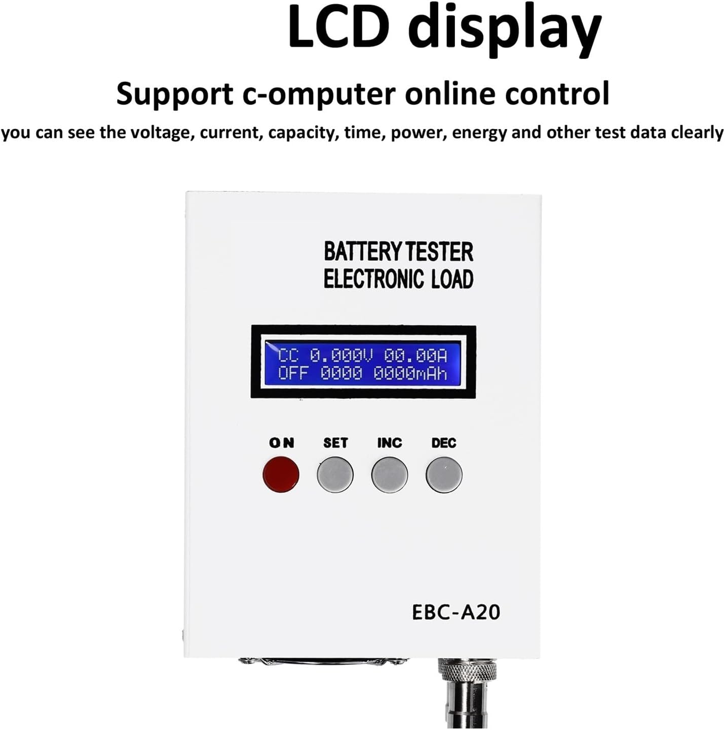 5A recharging, 20A discharge, the maximum power is 85W.Material: aluminum alloyVoltage setting: Discharge: 0.00-30.00V, the minimum step 0.01VRecharge: 0.00-18.00V, the minimum step 0.01V Current setting: Discharge: 0.10-20.00A Minimum step 0.01A (automatic limit current when power is overrun)Recharge: 0.10-5.00A Minimum step 0.01A (the maximum current is less than the supply current when the voltage is above 10V )Voltage test: 0.000-4.500V (low pressure gear) accuracy to 0.003V, error ±0.5%4.50V-30.00V (high presure gear) accuracy to 0.01V, error ± 0.5%Current test: 0.10-20.00A, accuracy to 0.01A, error ± 0.5%Capacity test: 10Ah, the resolution is 0.001Ah10Ah-100Ah, the resolution is 0.01Ahabove 100Ah, the resolution is 0.1Ah