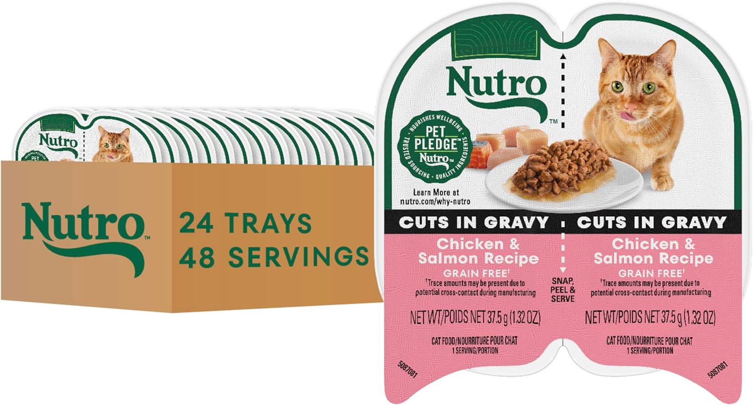 Nutro understands that pet owners want the best for their feline companions. That commitment is why Nutro partners with trusted farmers and suppliers to source high-quality ingredients and craft nutritious recipes both you and your cat will appreciate. This cat wet food gravy, Nutro Perfect Portions Wet Cat Food, Cuts in Gravy Chicken & Salmon Recipe, is formulated without grains and is rich in moisture, 100% complete and balanced for adult cats, and made with essential nutrients and antioxidants to support whole-body health. Made in USA facilities with the finest ingredients from around the world, this adult cat food recipe is crafted with natural ingredients plus vitamins, minerals, and other nutrients and formulated without artificial preservatives or flavors. As a premium, healthy cat food created for indoor cats who want grain-free nourishment and cat owners who want what's best for their cats, Nutro Wet Cat Food Cuts in Gravy Recipes help keep your cat well-nourished and pleased with variety.
